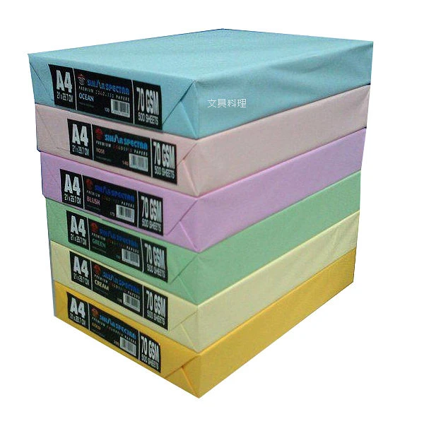 顏色:淺藍.淺黃.淺綠.粉紅. 玫瑰紅 金黃 磅數:70磅 1包:500張 歡迎公司行號新加入長期配合 另售80磅特殊顏色A4進口彩色多功能影印紙.,歡迎詢價
